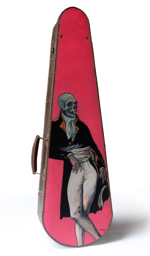 Painting onto vintage suitcases, hat boxes and violin cases, Le Fleming introduces an oil painting series about oil painting itself. Referencing random bookmarks of art history as early as the 15th century, the objects he has painted pertain to the origins of one’s desires and wants.