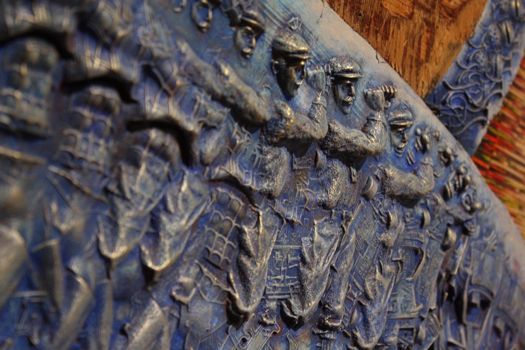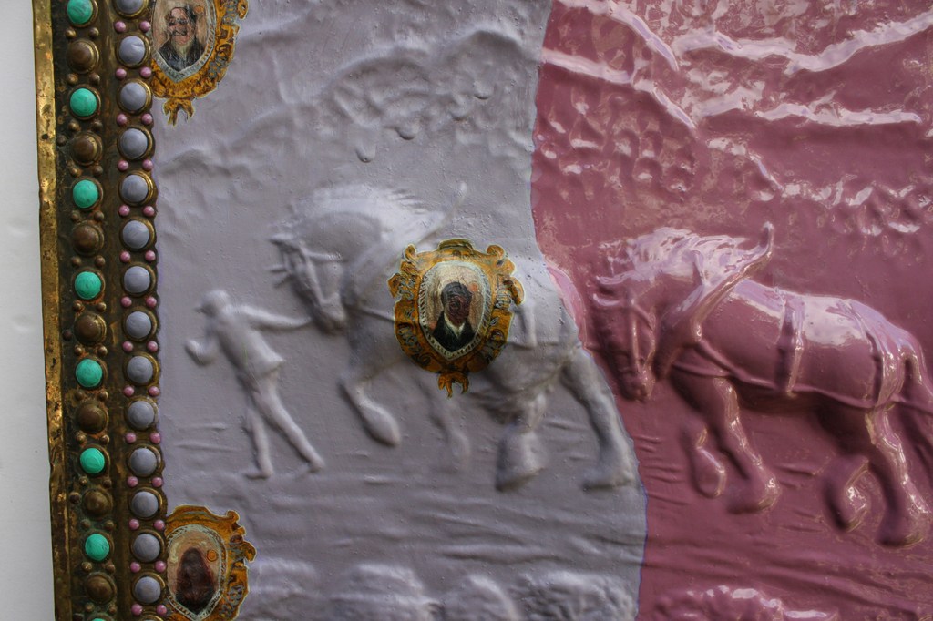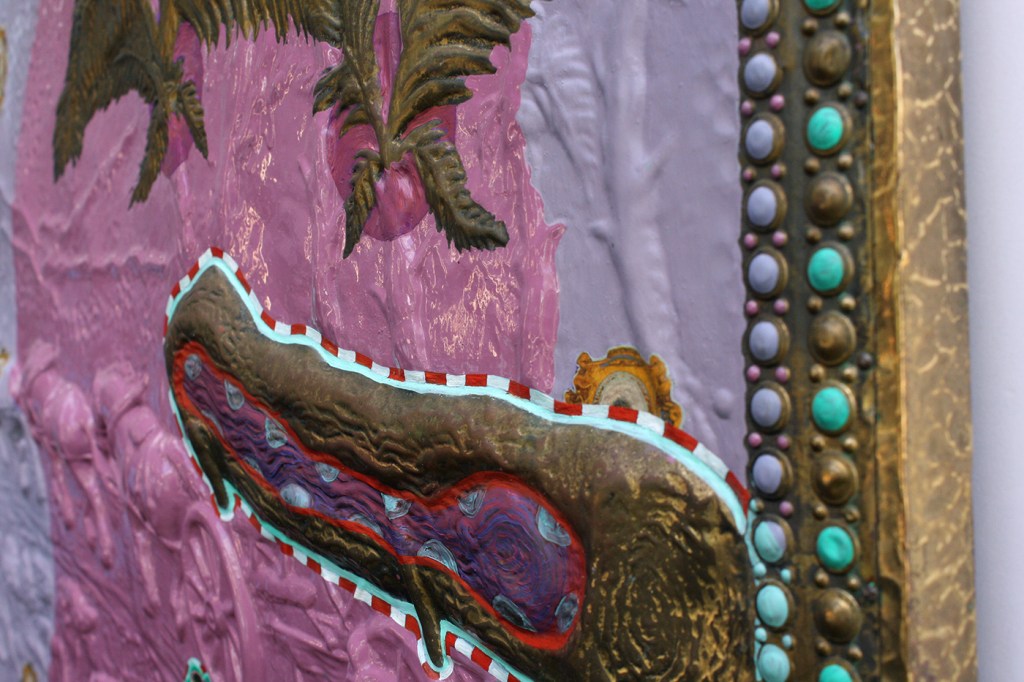 Māui Fireguard is part of Le Fleming’s recent explorations in mythology in which he makes images of reverence and reflection for today’s world. Appropriating from heraldry, iconography and folk art, he has painted apon 2D relief found artifacts that are unsettlingly familiar.