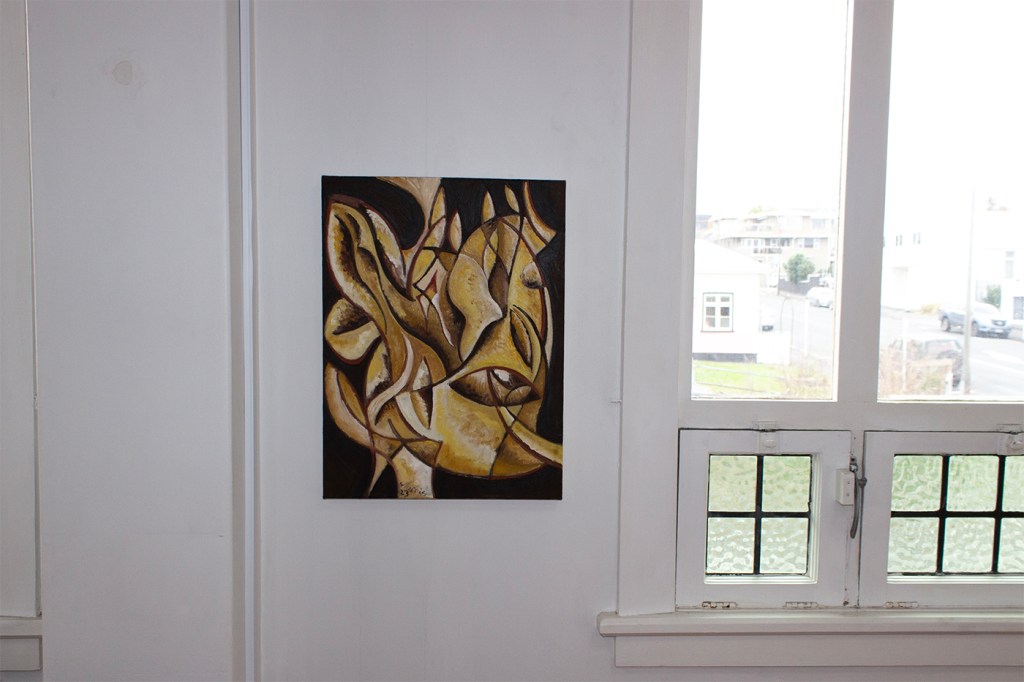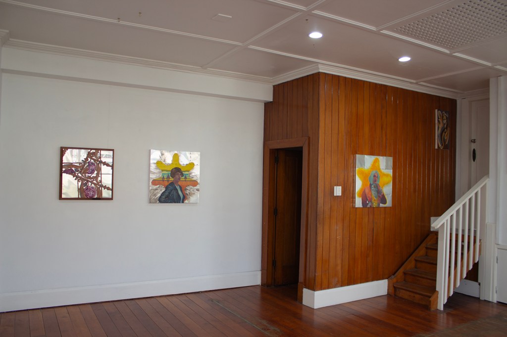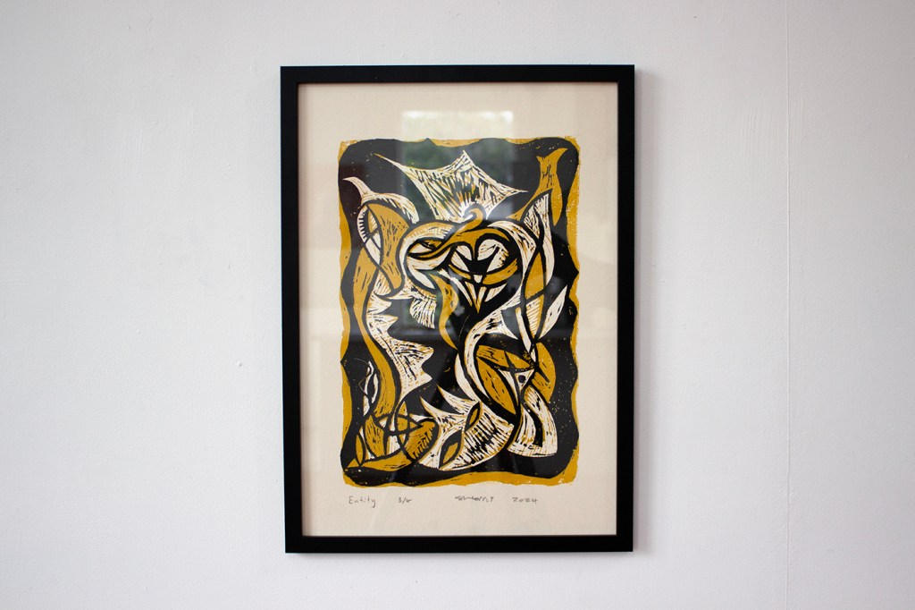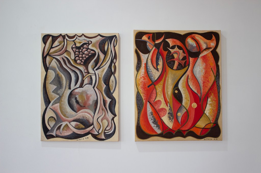 Block prints and two oil paintings on the right by Stu Morris